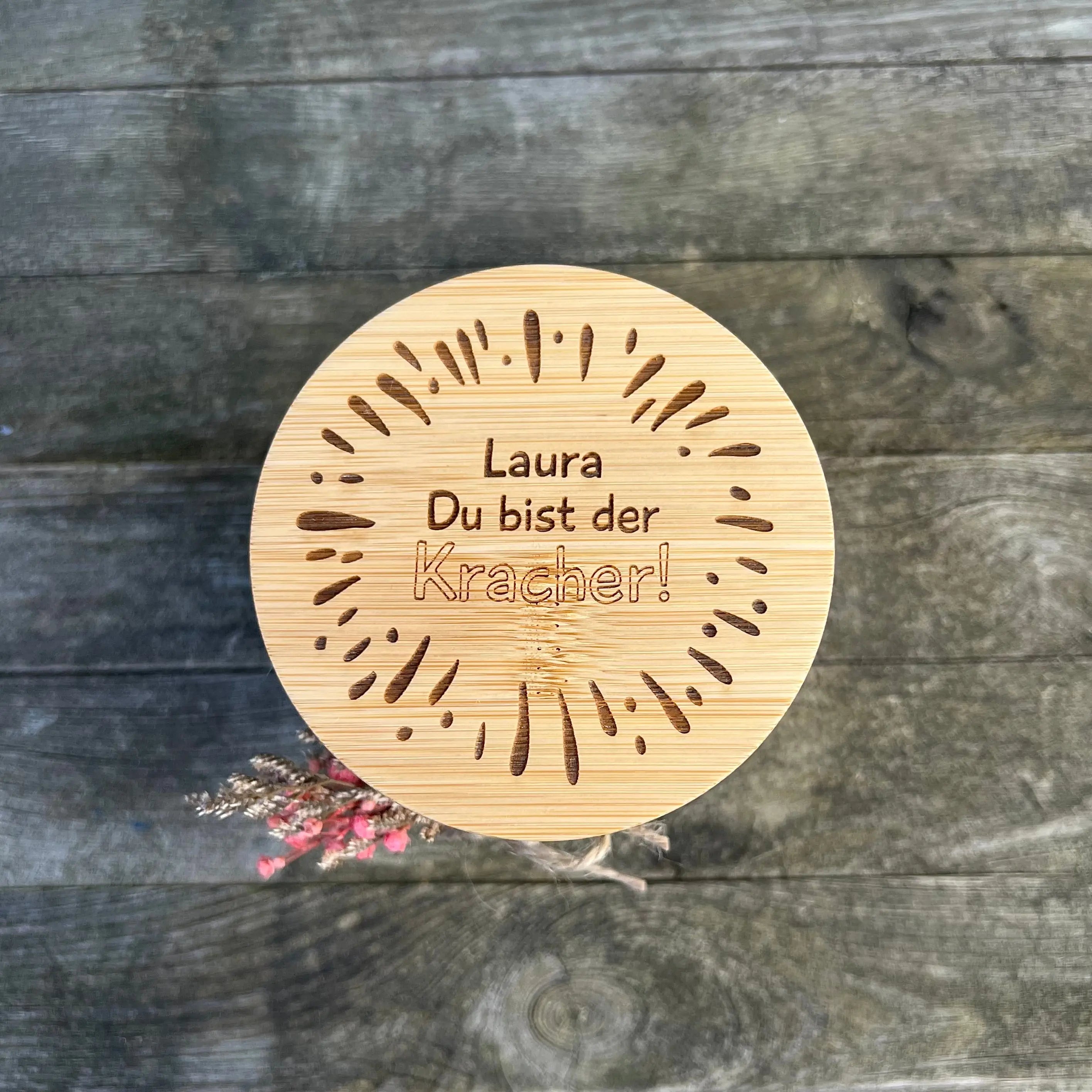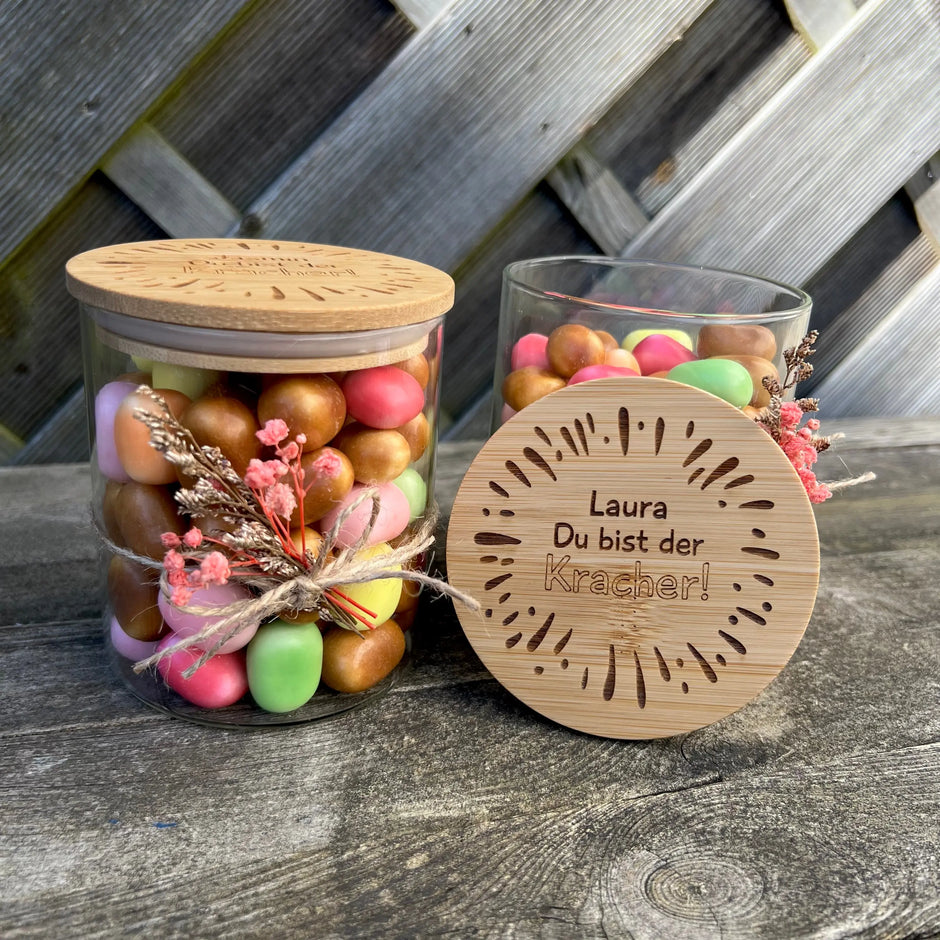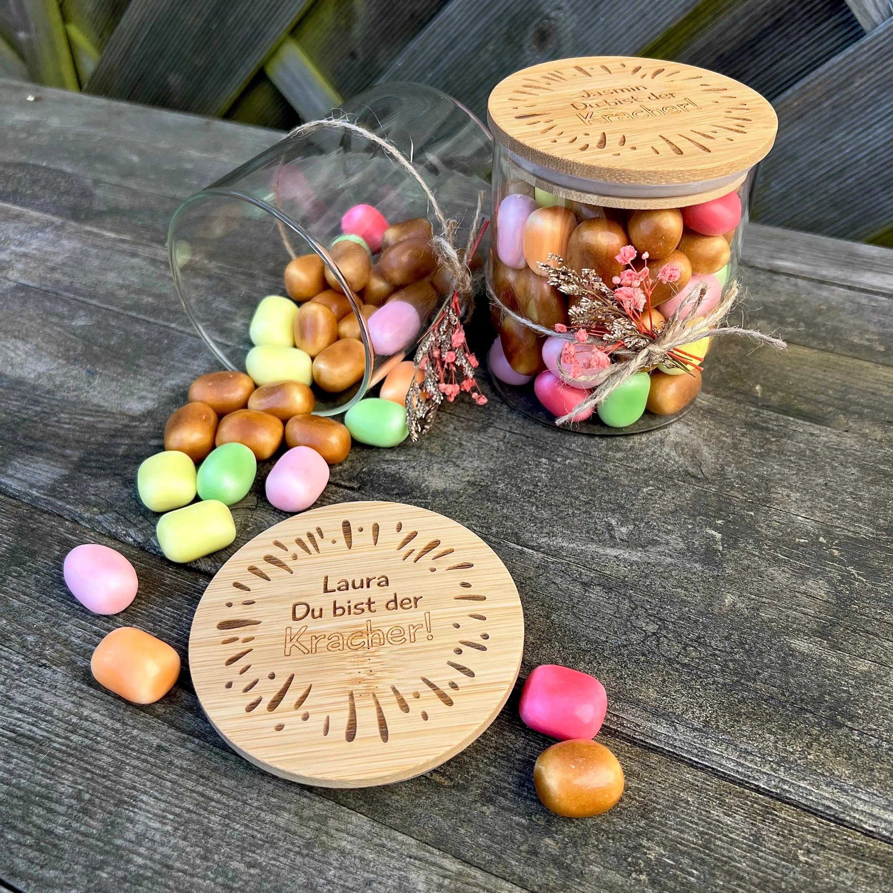 Mit unserem Kracher Glas schenkst du nicht nur leckere Überraschungen, sondern auch eine persönliche Botschaft. Süßigkeiten inklusive!